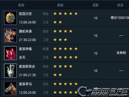 这个任务的经验和个人工资是最高的,堪称必做的活动。家族种植是家族活动之一,玩家前往家族庄园对桃树进行浇水10次即可完成任务,该任务每日可完成一次,在玩家完成任务后退出家族再次加入新的家族后,该任务在当日不可进行。玩家完成任务可领取一定的经验以及工资,并且获得10点活跃。