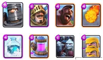 这类卡组的特点就是走的慢,大部分玩家都喜欢肉盾沉底,然后等过桥以后在身后放下输出,另外一路直接打出一发进攻即可,让对面无法在肉盾身后放下足够的DPS。对面就算守住另外一路,这一路的攻势也不会对塔造成多少伤害。