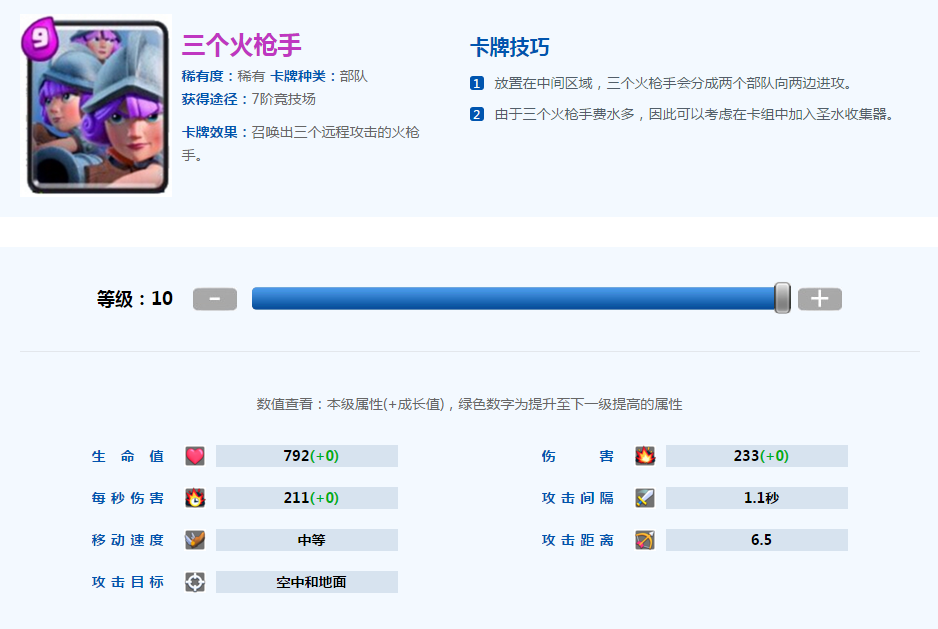 这三张卡基本稳定地占据了选择率最低的三强,皇家巨人获得了20%的伤害、三个火枪手减低了1点费用,瓦基丽武神生命值和伤害都提升了10%,下面我们依然用满级单卡的数据说话。