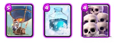 这次主要的改动就是在原本冰冻气球流的玩法基础上,加入了骷髅军团这一张新手一直唾弃的卡,原因很简单,当骷髅大军压境的时候,对手放出什么东西都会第一时间把输出打到骷髅身上,让我们有更多的时间准备冰冻法术控场。