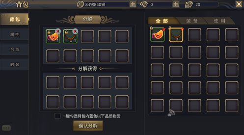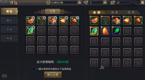 物品出售:点击“出售”按钮,可开启道具出售界面,在该界面玩家可以将自己不需要的道具出售,获得银币。也可以通过“一键勾选背包内蓝色以下品质物品”功能进行快速出售,省去很多选择的步骤。通过出售功能,玩家可以提高自己获得银币的效率,在游戏进行到某些阶段比较缺钱时,不妨试着卖掉一些不太可能用到的道具来换一些银两吧!
