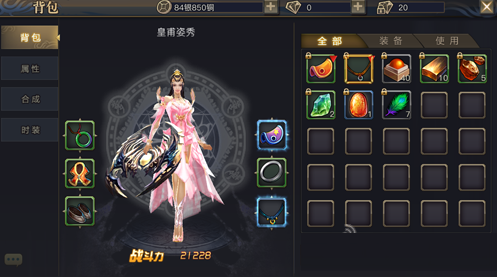 玩家在游戏中获得的道具,都会以图标列表形式存放在背包中,背包顶部是分类标签,分别是“全部”“装备”“使用”,分别对应全部道具、装备类道具、可使用道具,玩家通过标签切换,能够快速找到自己想要的道具。