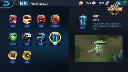 净化:因为钟馗的大招在释放期间是可以被打断的,所以净化所提供的让自身免疫控制持续1.5秒可以很好的解决这个问题。