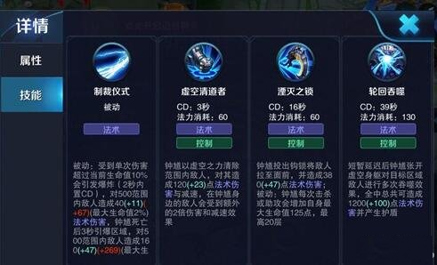 被动技——制裁仪式:受到的单次伤害超过当前生命值10%会引发爆炸,对500范围内敌人造成法术伤害,钟馗死亡后3秒引爆区域,对500范围内敌人造成高额法术伤害