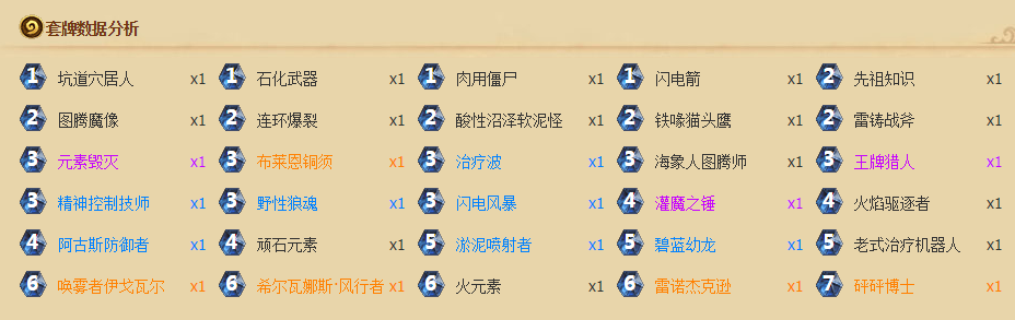想当年,在LOE之前,萨满在天梯出场率惨不忍睹,暴雪爸爸为了拯救萨满,出了天师,不要被他滑稽的外表所迷惑,抢起血来毫无人性,正是这张牌和板娘带领萨满走上“雷克萨”之路一去不复返。很多人都不是很喜欢快攻职业,比如我,所以我对天师萨并不感冒,我更喜爱控制型卡组,而萨满其实单解,AOE,法术直伤都不错,只是被过载机制给影响了。经过一系列试验,当然也到K神宇宙萨中借鉴了一部分,组了一套过载宇宙萨,效果还可以,特别是打控制型中速卡组,这套牌还是不错的。