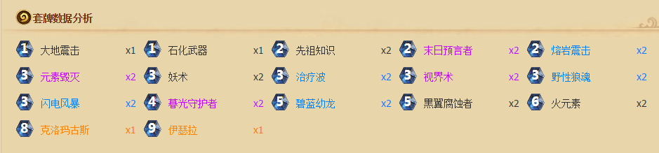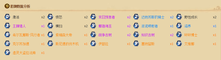 一套含多种高费橙卡的卡组,靠着德鲁伊的成长优势,能在较为早期时出一些大怪。若能够在艾维娜后使用激活多上几个大怪,对面会很无奈的,还有克尔苏加德的效果也不容小觑!