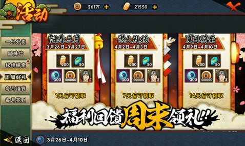 活动内容:活动期间,于周六、日登录游戏,即可前往“活动中心”领到大量金币、忍者鼬碎片等丰厚好礼,千万不要错过哦!