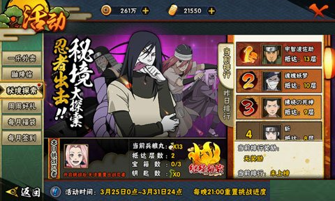 活动内容:活动期间,玩家可以使用系统提供的随机忍者,消耗兵粮丸进行探索挑战(兵粮丸可以通过普通副本,精英副本获得),探索进度每日重置并排名,前100名的玩家将获得大量奖励。除了排名奖励,还有更多成就奖励等你拿,快来参与吧!