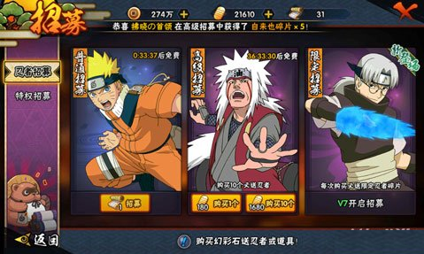 活动内容:高级招募可获得忍者增加宇智波鼬、白、手鞠、[咒印]君麻吕,下架凯、[一尾]漩涡鸣人、夕日红、奈良鹿丸