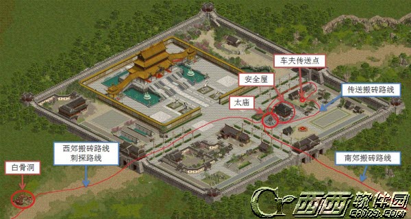 “太庙搬砖”为征途玩家所熟知的三大日常活动之一,玩家需在活动规定时间内,在本国王城太庙接搬砖任务,并自动寻路到敌国太庙(也可不接任务直接在敌国太庙搬砖),通过在敌国太庙进行搬砖操作,然后将所搬砖运回本国太庙交付任务;