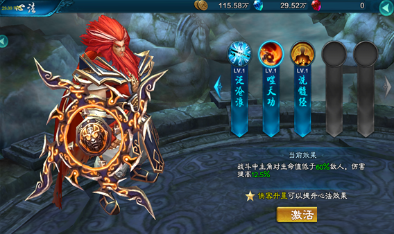 战斗中主角对生命值低于60%敌人,伤害提高15.5%(心法效果随侠客星级提升)