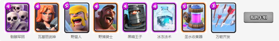 在新版本更新之后,我经常使用骷髅军团这张卡,这张卡没有任何加强但是确实在许多情况下都比野蛮人好用,特别是应对双骑流的时候,两个王子一过来骷髅军团直接带走他们。而黄毛则是骷髅军团在偶尔会被箭雨解掉之后的救场卡,可以补救大部分状况。
