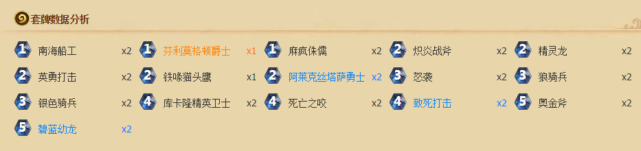 这套牌我更喜欢叫它:龙骑士战士。因为我在里面添加了银色骑手和狼骑兵这两张卡。因为这两张卡能在前期换掉对手一些关键卡牌(如:坑道穴居人、飞刀杂耍者、火妖、奥秘守护者等)。在前期可以打断对手的节奏,为自己建立起优势。