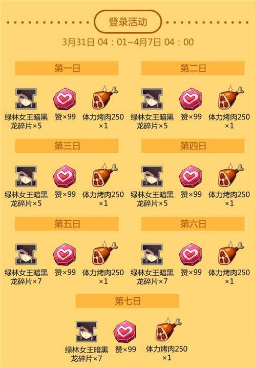 第七日:暗黑龙碎片x7、赞x99、体力烤肉250