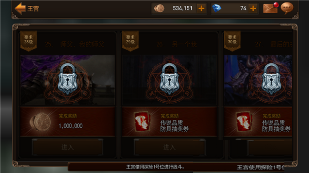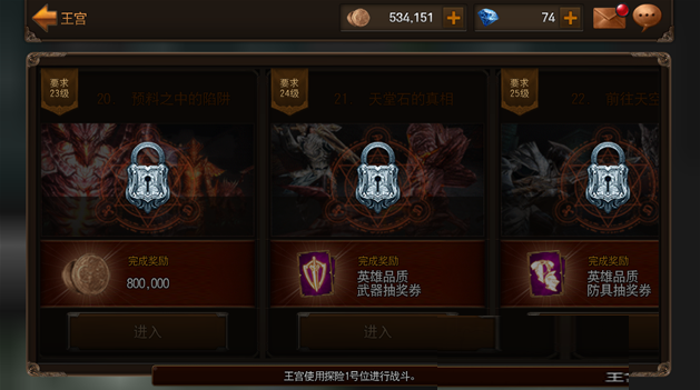 王宫一共有30个关卡,随着等级的提升开启。每提升一级等级就能开启一个关卡,在我们达到30级之后就能开启所有的关卡了。并且王宫中的每个关卡都只能挑战一次,获得奖励之后就不能再次挑战了。