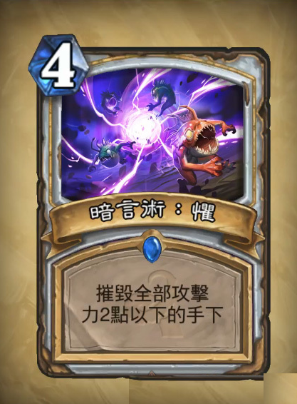 TOM认为这张卡牌并不是特别好用,只消灭2点攻击力以下的随从,和暗言术:痛消灭3点攻击力一下的效果相比,适用性就低了很多,包括水元素、飞刀、科多之类都解不掉。