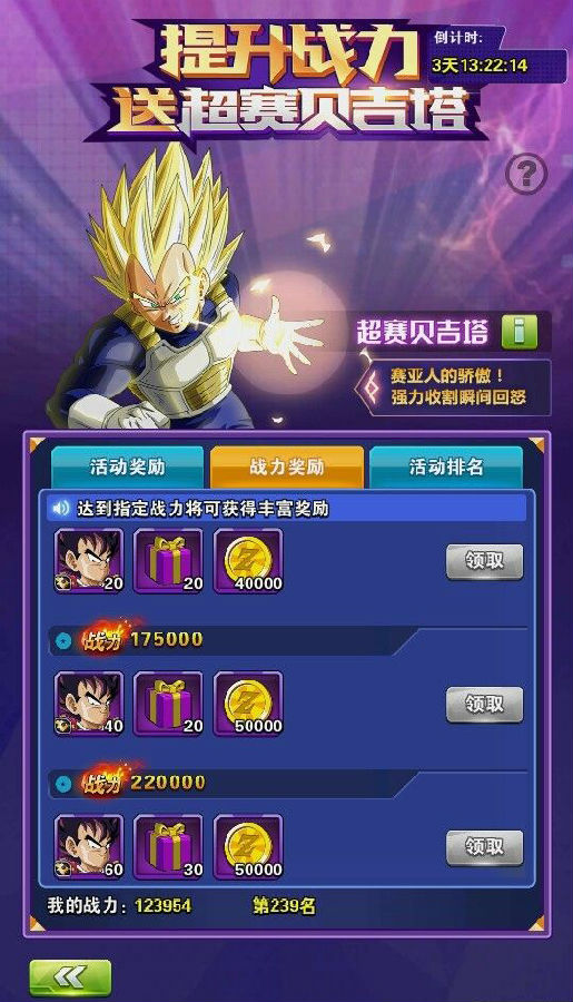 其实贝吉塔的获得方法很简单,进游戏之后就有一个提升战力赠送贝吉塔的活动,只要努力的提升战力,甚至可以将贝吉塔提升为超级赛亚人哦。努力提升战力吧。