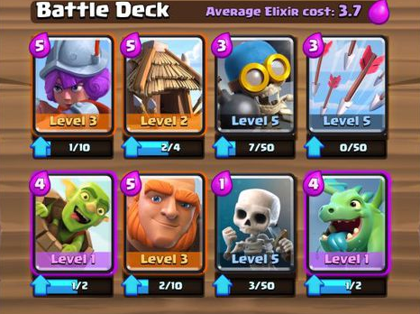 卡组构成:火枪手,哥布林小屋,炸弹人,万箭齐发,哥布林飞桶,巨人,骷髅兵,飞龙宝宝