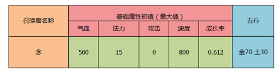 “念”作为一个敏血神兽,可通过五行天书合成获得(金铭神珠*1,兑金之精*2,艮土之精*2)。附带的天生技能,也可使一个单位受到的物理伤害大幅降低,受到的法术伤害一定比例提高。精致的造型,配合强力的属性设定,也将为战场上的玩家提供更多的支援和帮助。