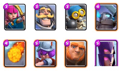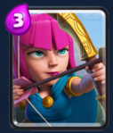 弓箭手:类似于长矛哥布林,弓箭手(简称MM)多了一费,但是伤害更高,血更厚。拿八级卡牌为例,mm是241点血,长矛只有100点,所以长矛会被箭雨,飞龙宝宝,法师,小闪电等等卡牌一击击杀,但mm可以在这些情况下保证生存。不过,高等级游戏中,mm会很快地被公主淘汰掉。