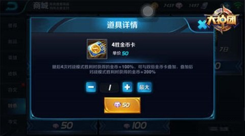 胜场金币卡:每场对战模式胜利时获得的金币+100%,可与双倍金币卡叠加使用,叠加后的对战模式获得的金币+200%。