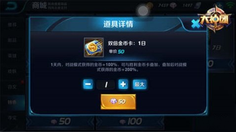 日金币卡:一天24小时内所有对战模式获得金币+100%,可与胜利金币卡叠加使用,叠加后的对战模式获得的金币+200%。