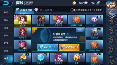 说下特殊的两个英雄,韩信和武则天,只能通过幸运夺宝获得,所以这个点劵和钻石的必花的。不够也并非没有小技巧,就是每周的奖池物品会更新。在进行夺宝前,看看奖池里的其他商品是否为未拥有的,如果未拥有的商品过多,就不妨参与这周的夺宝,在中大奖前也能把其他未曾拥有的商品收入囊中,也算是省掉另外花销的费用。