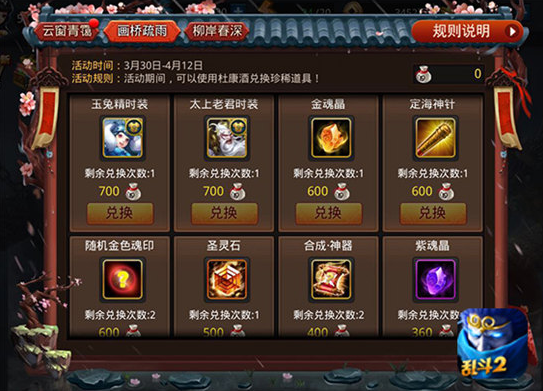 除了兑换两套精美新时装外,即日起至4月12日期间,玩家只需完成活跃活动“云窗青霭”,或参与蟠桃园、夺取经文以及匹配对战不周山等日常玩法,便有机会获得活动专属道具“杜康酒”。搜集到一定数量后,就可前往活动界面兑换包括金魂晶、圣灵石、圣灵石配方、和福禄宝箱在内的各种稀有奖励。打开福禄宝箱更有机会获得高级武器合成材料,集齐套装召唤专属特技,战力值瞬间爆表!