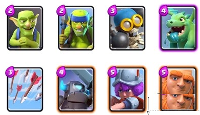 皮卡、王子切后排,切肉;火枪守空;龙宝、箭雨、AOE清群。哥布林引诱对手遛狗。