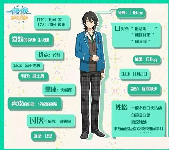 性格:一般不在白天活动,自称吸血鬼、喜欢独处、单方面超级喜欢弟弟朔间凛月