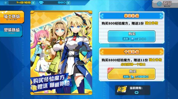 补给是获得灵装最快的方法,但是需要消耗钻石,另外还可以通过活动、任务获得的补给券进行购买。一次 1 张券,10 次补给则是 980 钻石,而且还多赠送 1 个。所以在前期送的补给券,最好都攒起来进行 10 连抽以加大获得高等级灵装的几率。