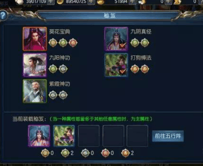 玩家可在秘笈信息标签页下装备心法秘笈(最多装载5本秘笈)。通过玩家所携带秘笈拥有五行元素的个数,计算得出最多的一种五行属性作为玩家的主属性。