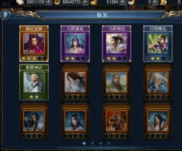 秘笈共有50种,分为5个品阶,每个品阶里有10种秘笈。五个品阶,最低1星,最高5星。