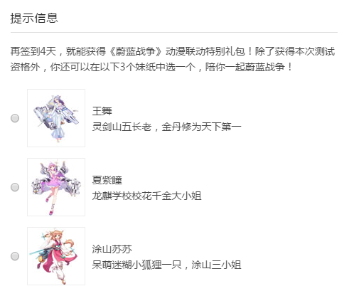 蔚蓝战争赠送的三个妹子分别是王舞、夏紫瞳、涂山苏苏。