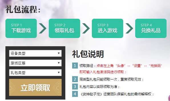 礼包领取路径说明:点击左上角“头像”--“设置”--“兑换码”即可输入礼包激活码进行领取;同类型礼包只能领取一次,重复领取无效;礼包内容以实际领取为准;《武神赵子龙》运营团队保留礼包的最终解释权。