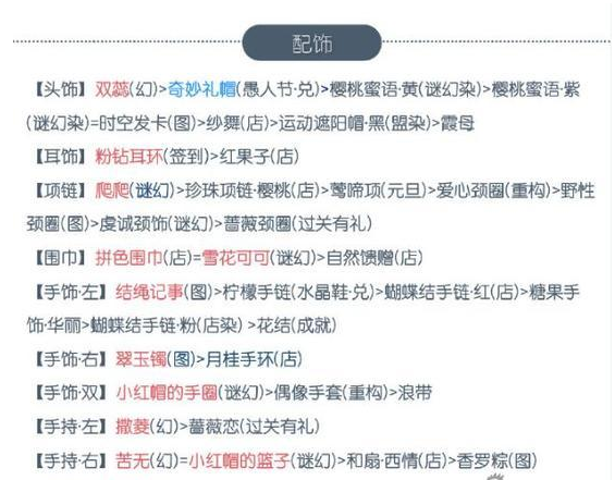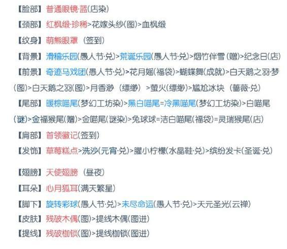 特殊:普通眼镜·蓝、萌熊眼罩、花月媱、金福猴尾、残破枷锁、残破木偶、天使翅膀、首领徽记、纪念日、天元圣光