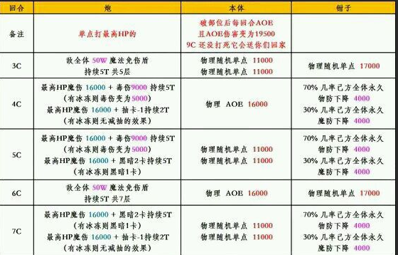 3C:炮给全体加50W魔法免疫盾,持续5回合(即3C-7C),一共5层,本体2下11000单点,钳子17000单点,点名伤害39000