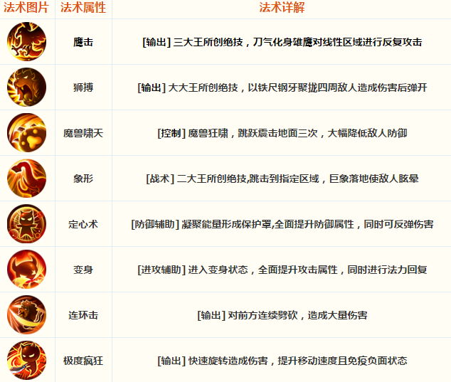 三位大王从百兽生死相搏中领悟拿手秘技,狮搏、象形、鹰击均糅合了力量与咒语。