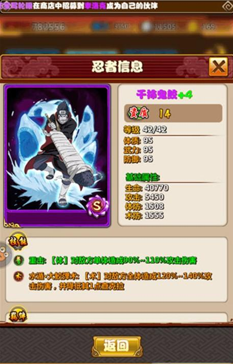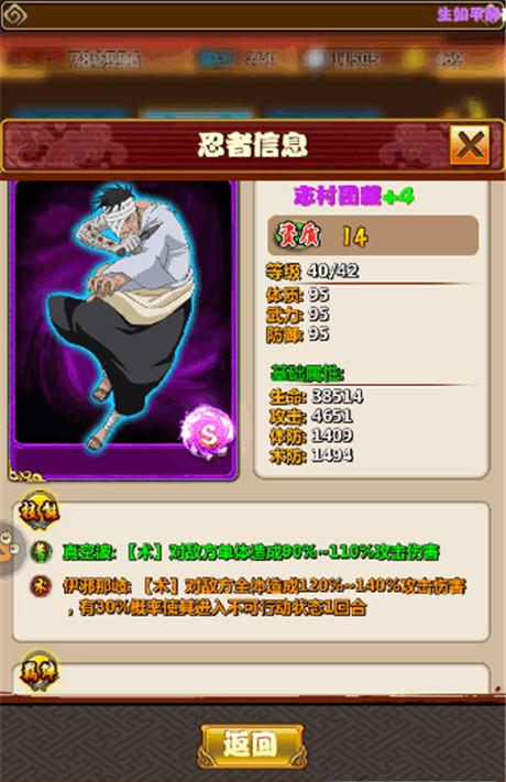 志村团藏(30%攻击羁绊)群体术攻30%几率令对手不可行动一回合