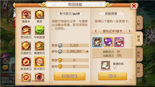 2.制卡技巧共100级,使用银币和帮贡升级,不能超过玩家等级+ 10级。