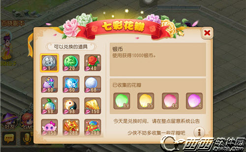 1、七彩花瓣只有在特定时间找到送宝花童处才能兑换;