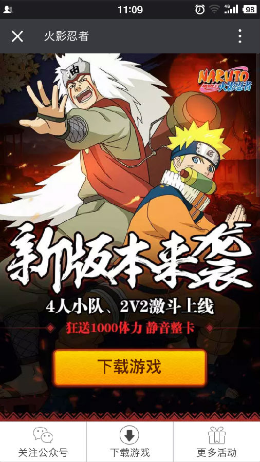 静音整卡和1000体力免费送是为庆祝火影忍者手游4人小队、2V2激斗上线而推出的幸运活动,微信端收到推送的玩家可通过链接进入领取。