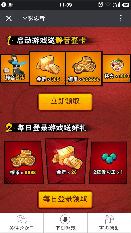 然而并不是所有玩家都有如此福利,送静音整卡和1000体力仅针对被被抽取为幸运玩家的忍者学员。不过也不要灰心,所有玩家都可以参与活动2,每日登陆领取铜币*8888,金币*28,2级青勾玉*1