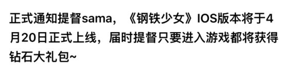 钢铁少女安卓版已经推出一段时间了,那么ios版本又是什么时候上架呢?目前官方给出了消息,已经确定4月20日正式上架,即时登陆的玩家均可以获得礼包一份。