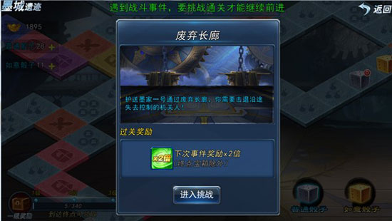(5)关卡事件,经过或者停留都会触发,触发后必须要挑战通关才能继续探索墨城遗迹;同时,通关后,将获得一个加成倍数,下次探索奖励将获得这个倍数加成(终点宝箱不受加成):