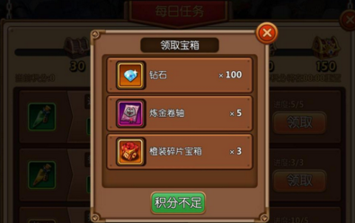每日任务中,完成下面的指定任务即可获得活跃度,钻石就处于活跃宝箱中,建议每天拿满150点活跃度,一共可以获取210钻石哦