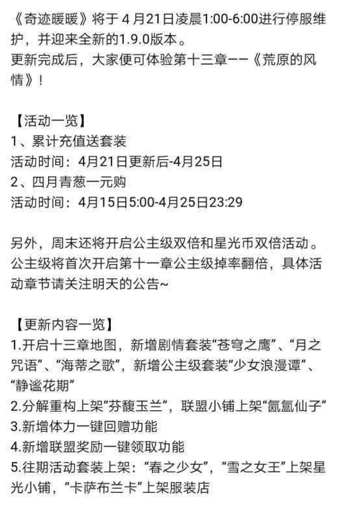 奇迹暖暖4月21日就要进行1.9.0版本的更新了,此次更新主要是剧情第十三章的更新以及公主级双倍星光币双倍活动,同时有多项功能优化,如体力一键回赠。下面就和西西一起来看看吧!