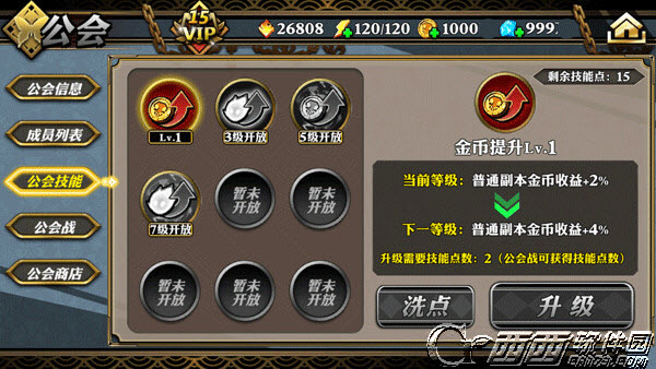 会长消耗技能点对公会技能进行配置,公会技能提供所有公会会员属性加成和额外收益加成。会长可花费钻石重置公会技能。