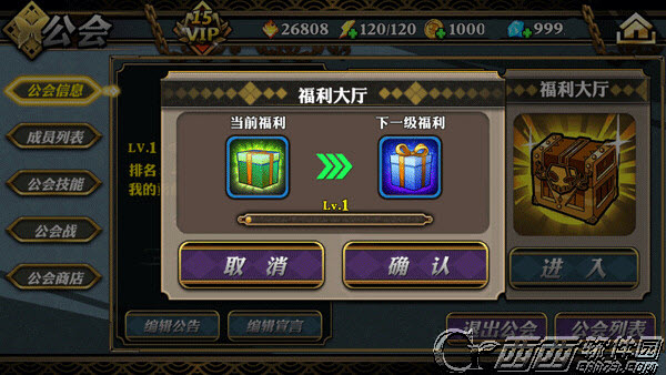 玩家每日可领取公会福利,公会福利内奖励内容随着公会等级而升级。