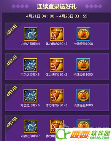 4月21日内功之印章x4、体力烤肉250x2、卡牌经验1000